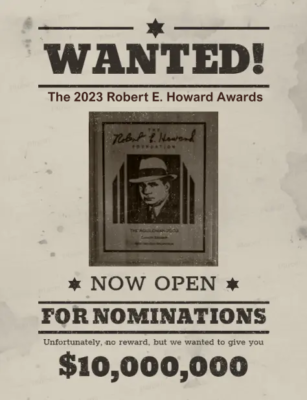 We are pleased to announce the opening of nominations for the 2023 Robert E. Howard Awards starting on November 30, 2022. The Robert E. Howard Foundation has revised the rules and categories for the awards, so please read over the information below. Some categories have changed, and there is a new category for works of fiction. We have also brought back the Black River Award. Under the new rules, nominations are due in to the Awards committee by January 15, 2023, with the Awards committee selecting the top nominees in each category for the final ballot by January 31, 2023. The Final ballot will be uploaded on a website with its address sent out to all current Robert E. Howard Foundation members for voting on the winners on February 15, 2023.
