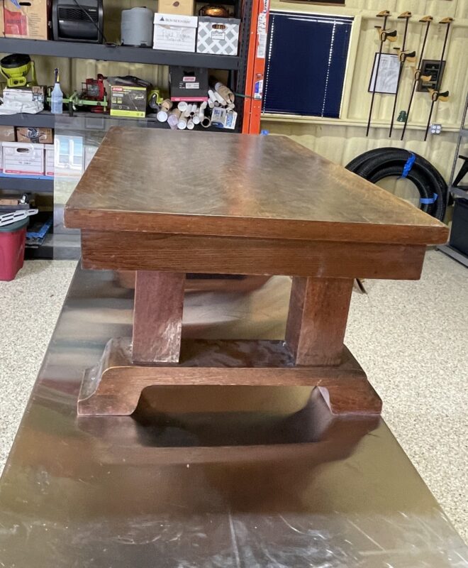 Over the years, the table has gone through some modifications. The legs were unbolted from the table, ten inches sawn off of each, and the legs reinstated to create a coffee table. Irma later added a glass top to protect the tiger oak veneer, keeping the beautiful tiger oak top in relatively good condition despite its age and everyday usage.